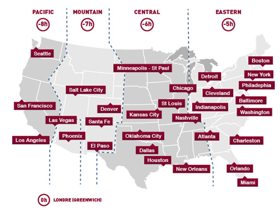 Les Etats-Unis continentaux sont répartis sur quatre fuseaux horaires : Eastern, Central, Mountain et Pacific Time. Il y a 3 heures de différence entre la côte Atlantique et la côte Pacifique.